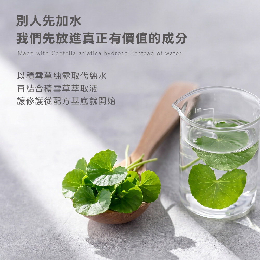 - 使⽤「積雪草純露」取代純⽔,並添加⾼濃度的「積雪草萃取液」,穩定膚況舒緩肌膚。