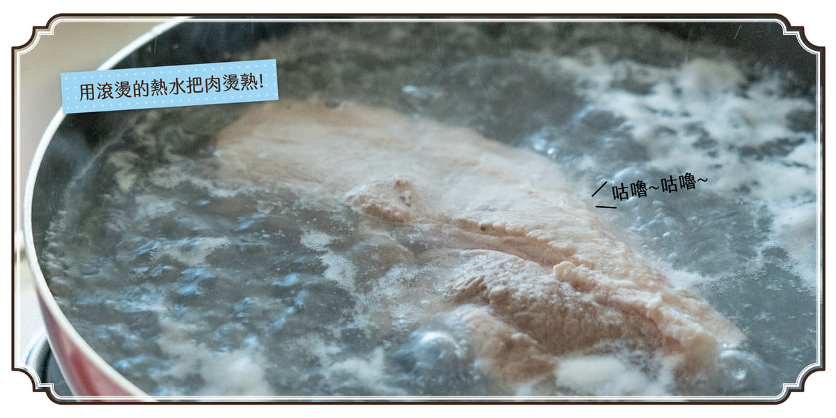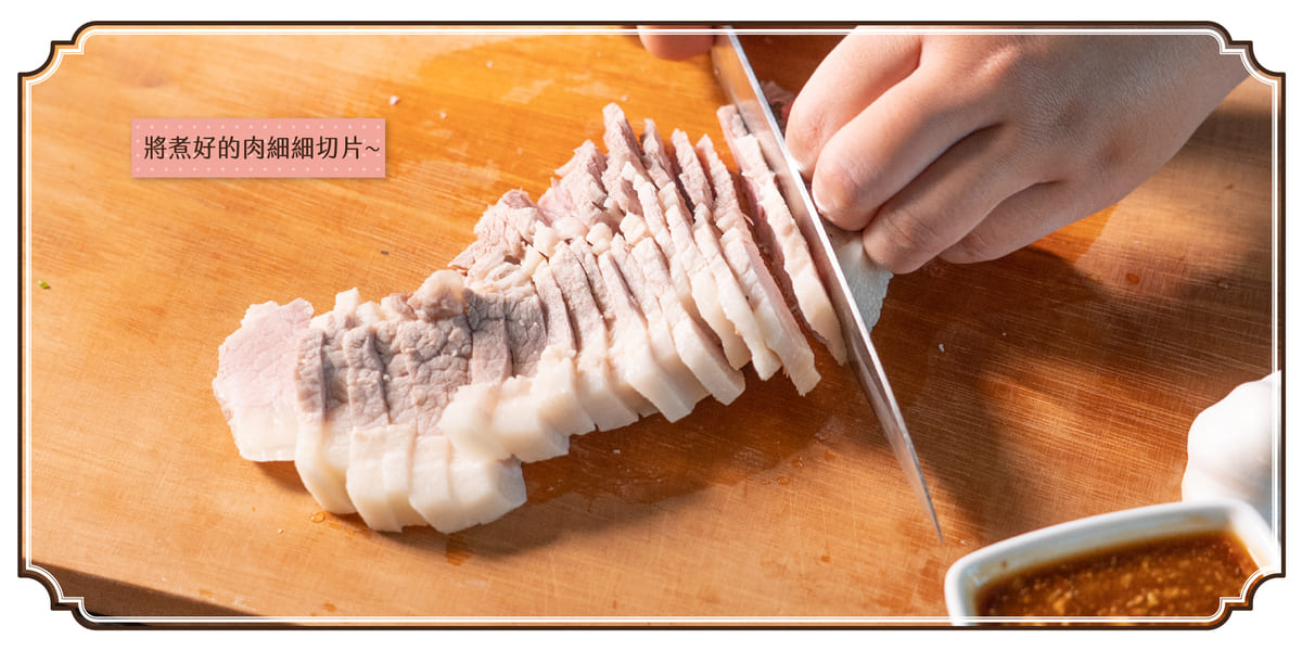 首先先將白肉煮熟(講究一點的可以加入薑、蔥結、米酒去腥),煮熟後撈起放涼。