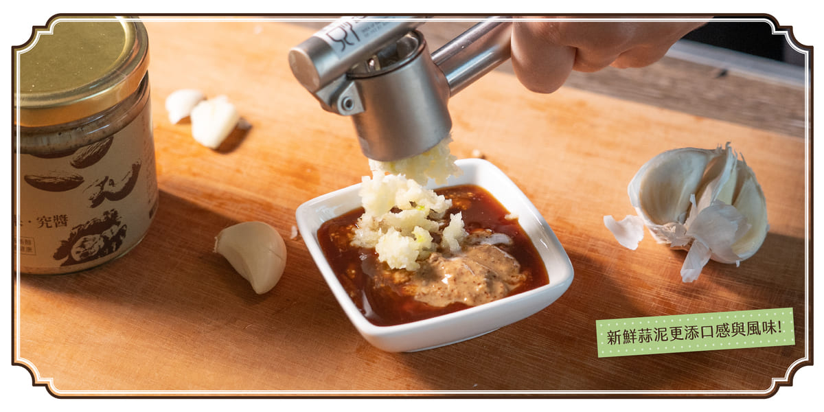 蒜頭去皮後壓成蒜泥,與究醬、醬油調和,攪拌均勻。