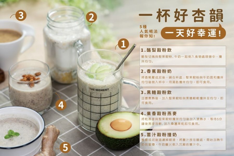 1. 酪梨穀粉飲:酪梨切塊與堅果穀粉、牛奶一起倒入食物處理器中,攪拌均勻即可。