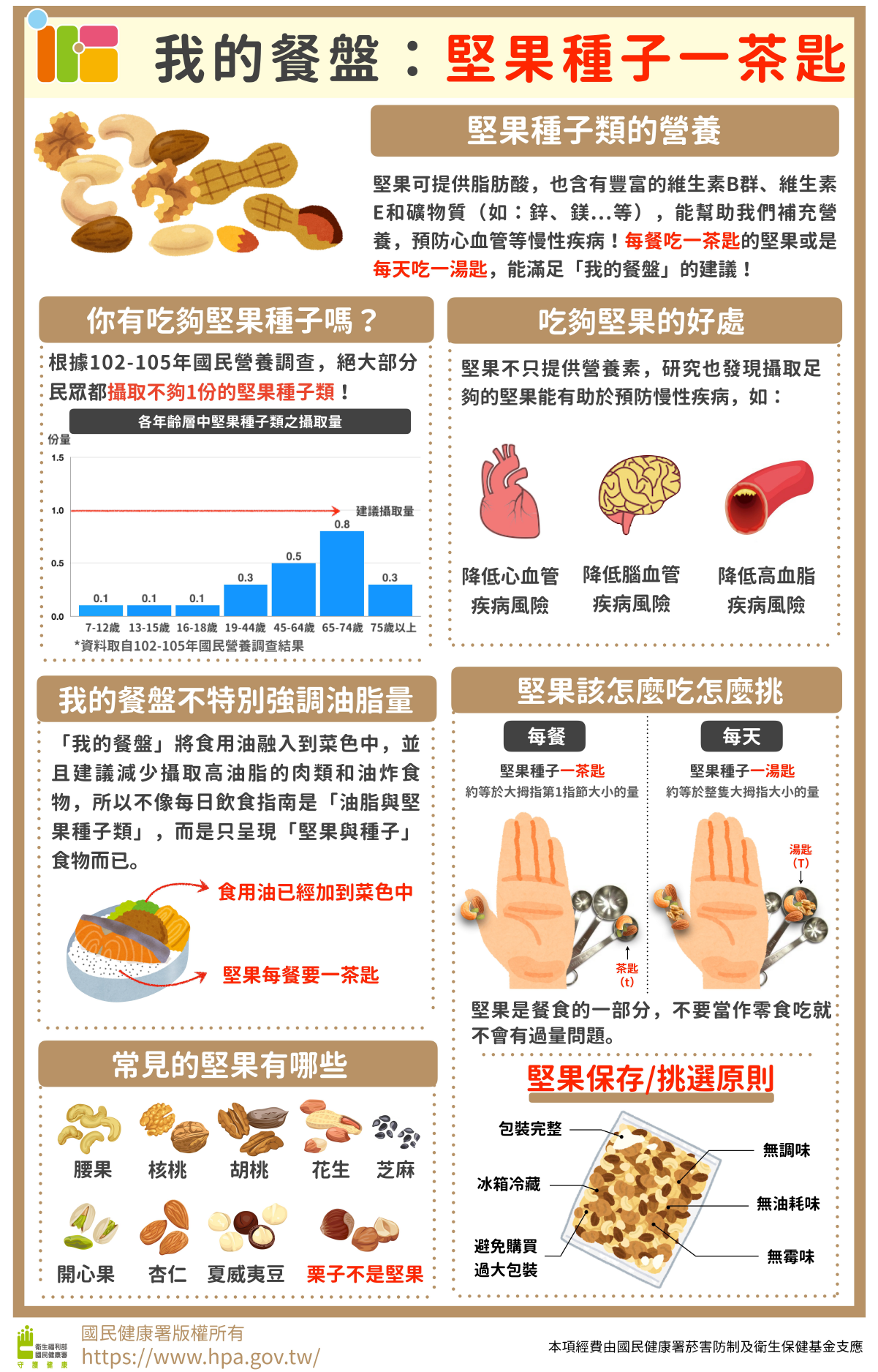國民健康署王英偉署長表示,每天1湯匙或每餐1茶匙的堅果種子,就可以達到營養的建議量,再透過選「原味」、吃「適量」、巧「搭配」三撇步,善用食材變化,兼顧營養及美味。