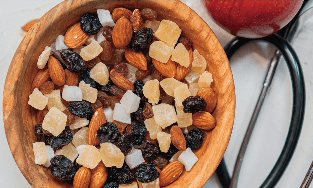 以俄羅斯國際太空站的日常菜單為例,堅果在其中佔有相當大的比例。早餐包括奶凍搭配堅果、馬鈴薯泥搭配堅果、木梨脆片、無糖咖啡及維他命。午餐則有梭鱸魚凍、羅宋湯配肉、匈牙利燉牛肉佐蕎麥、麵包、黑醋栗汁和無糖茶。晚餐包括飯、肉、花椰菜、起司、堅果和含糖茶。宵夜則有熟成牛肉、腰果、桃子和葡萄汁。
