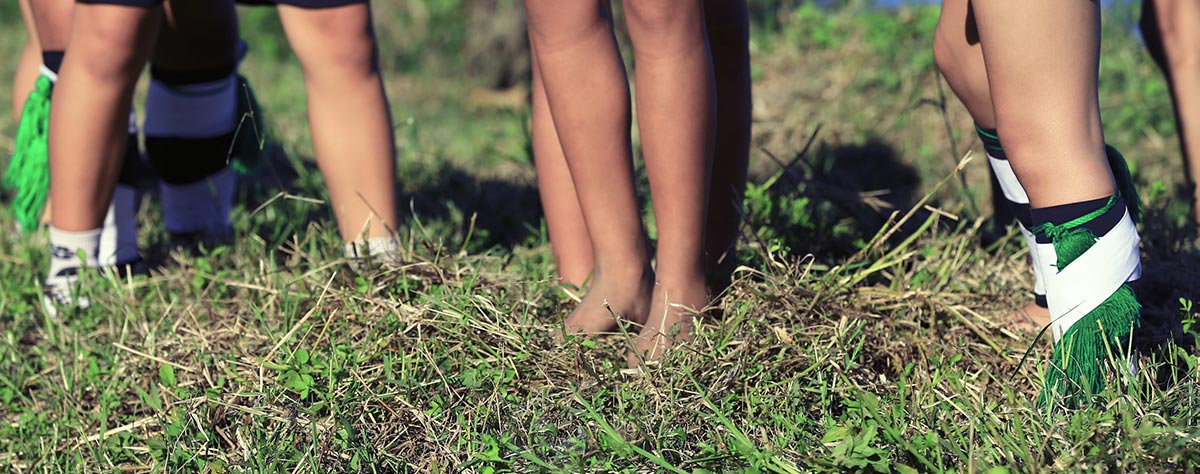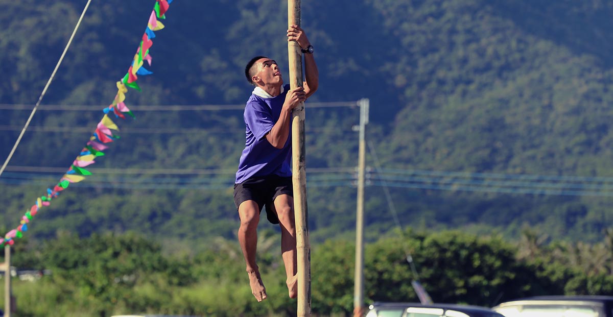 各部落強壯的勇士腳踏光滑竹筒奮力上升,