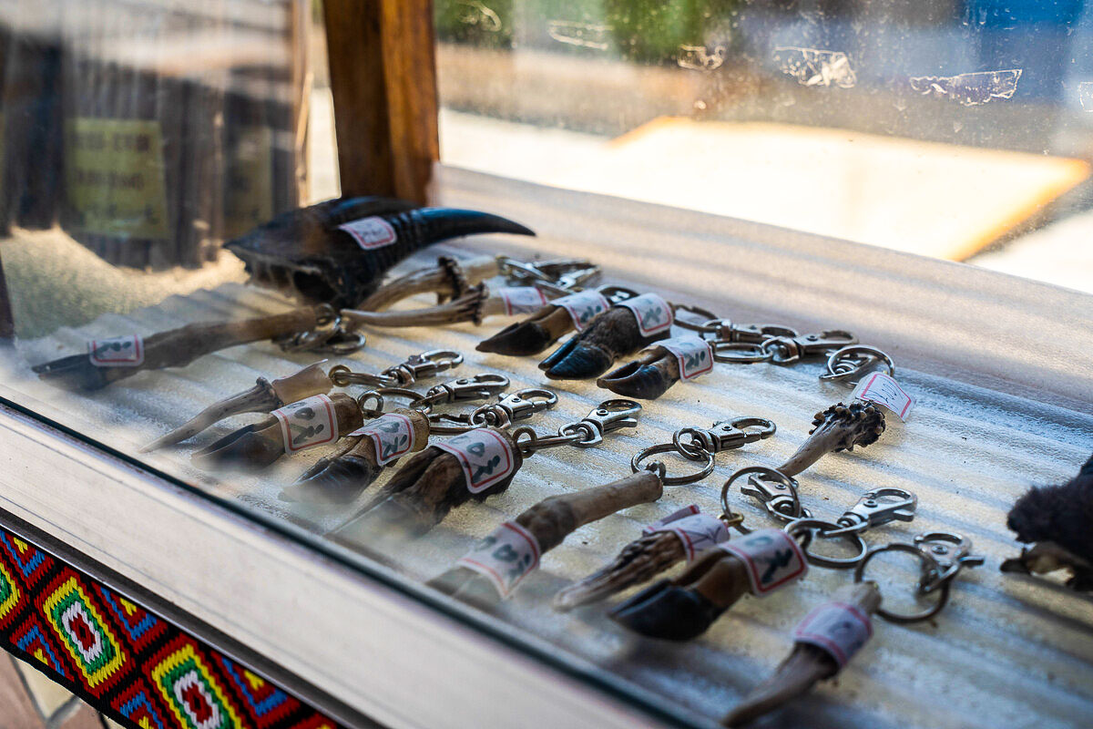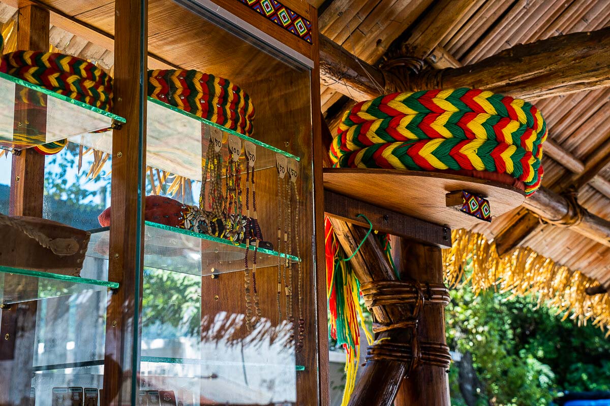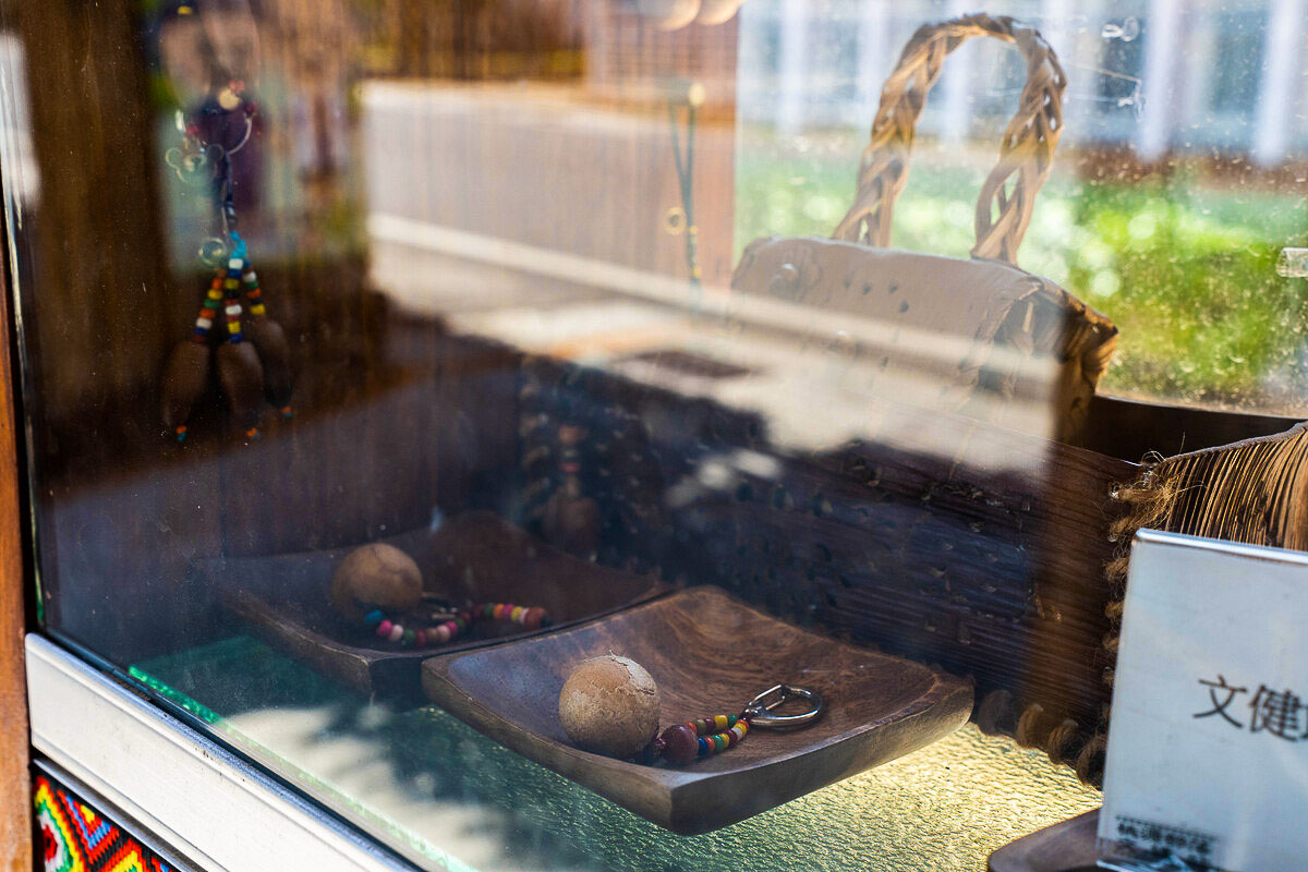 涼亭左側的玻璃展示櫃陳列著部落狩獵並製作的工藝品。