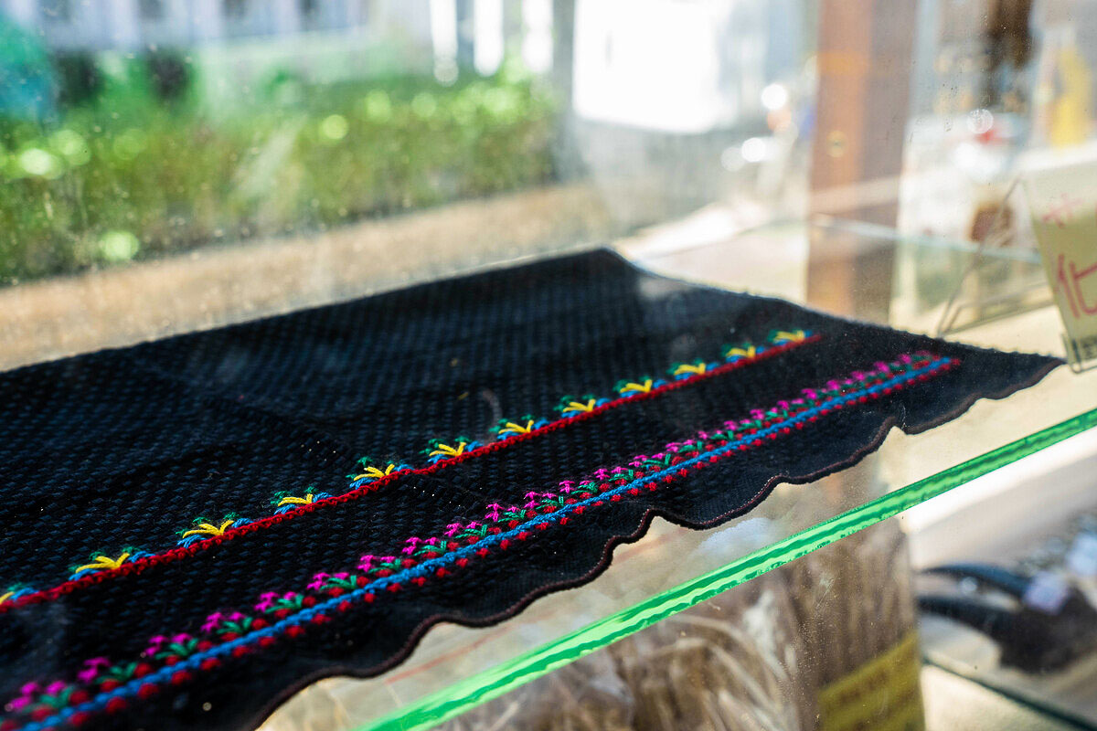 而從涼亭內部仰望,更能欣賞到柱子上布農族的精緻編織和刺繡工藝。