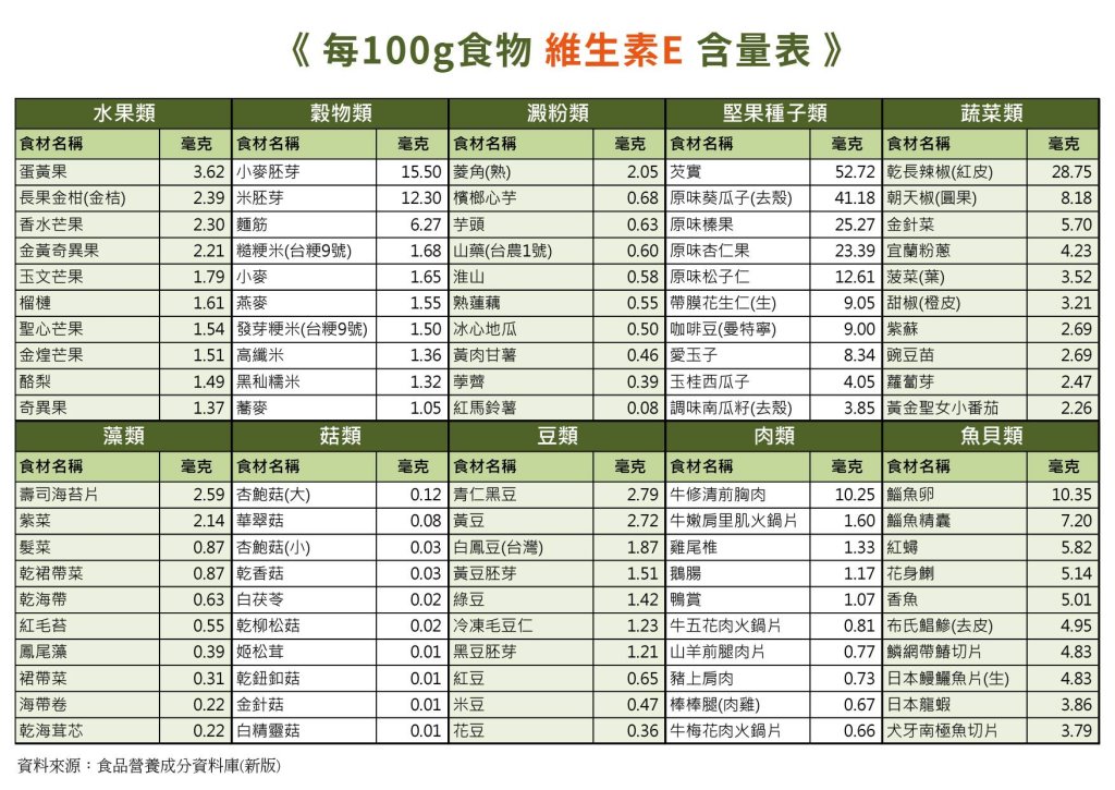 現代人飲食西化及精緻化,是導致營養不平衡且攝取不足的原因,想要獲得最佳的維生素E的保健效果,從均衡的飲食食物中攝取天然的維生素E是最有效的。我們整理出常見富含維生素E的食物給您參考。