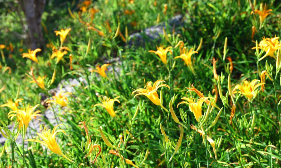 從山頂綿延一路向下綻放的金針花,將整座山灑滿黃澄澄的壯麗,