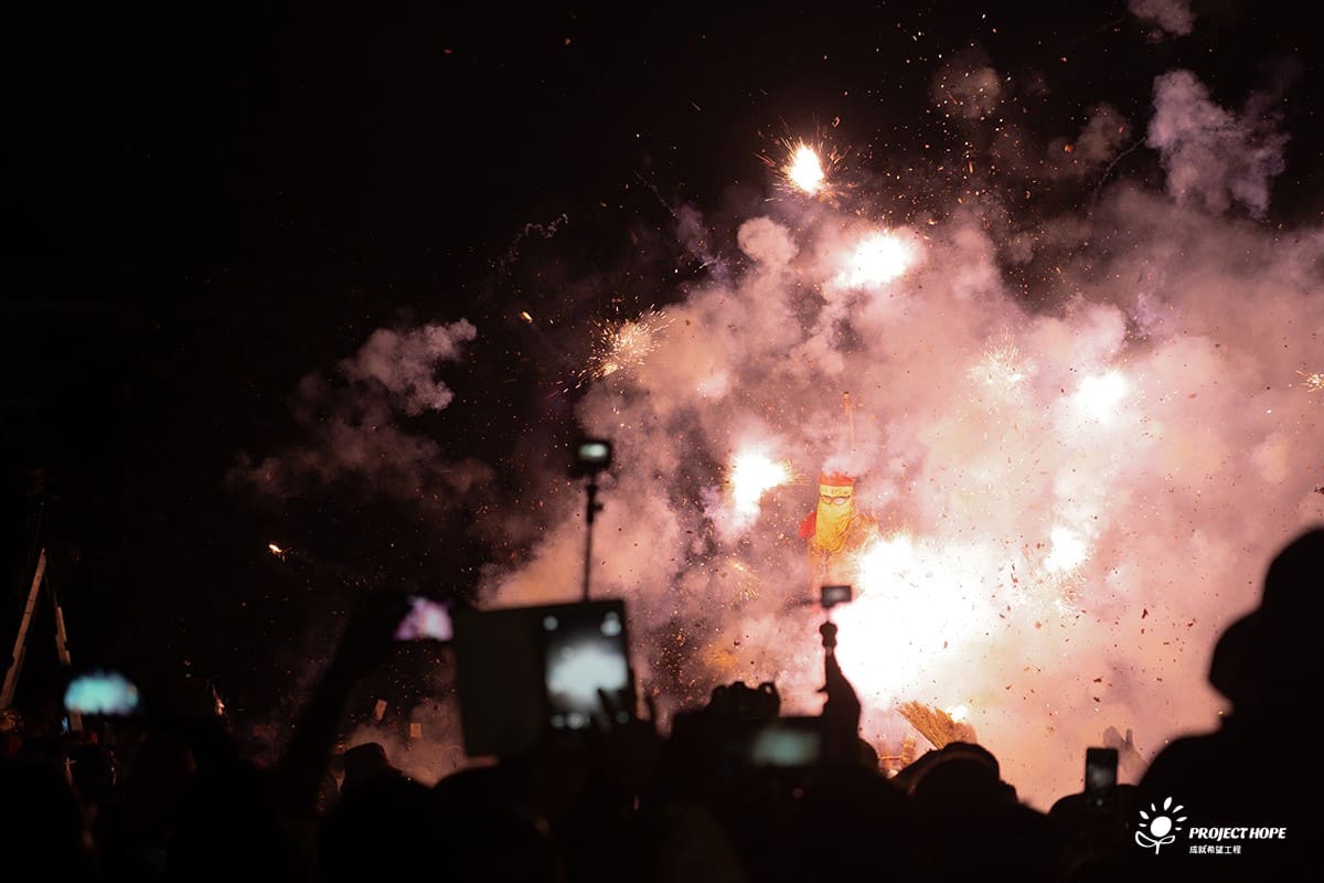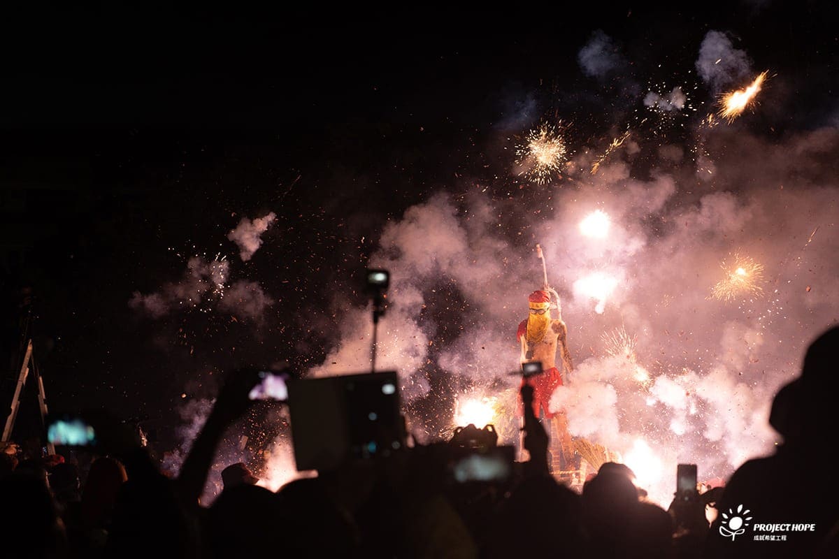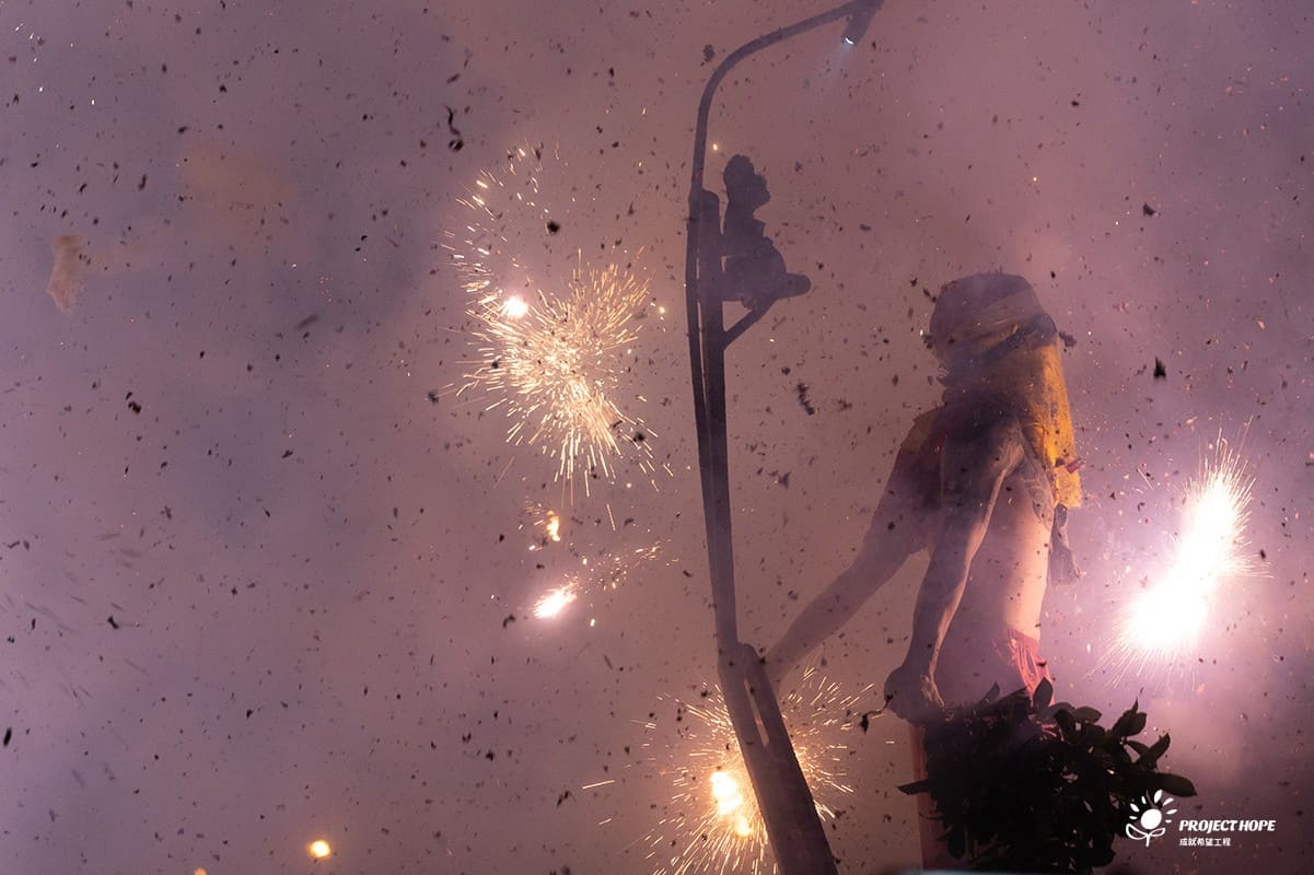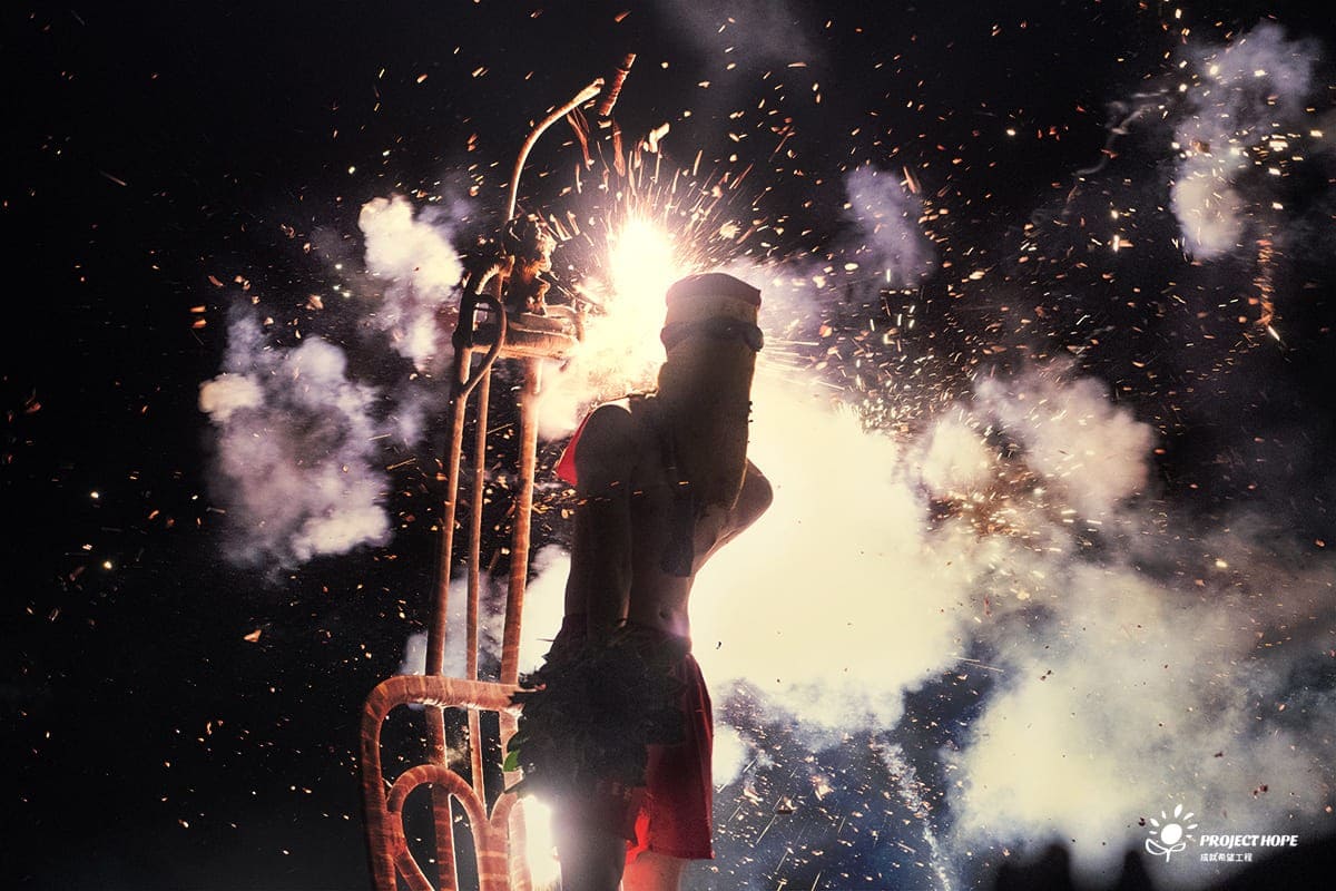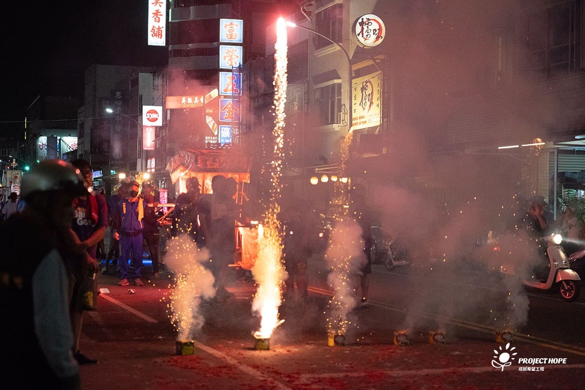 一串光劃過神轎旁,發出劈哩啪啦的巨響,且還要注意不要傷到肉身寒單,以上的配合,成就這場聲光效果震撼的民俗表演。