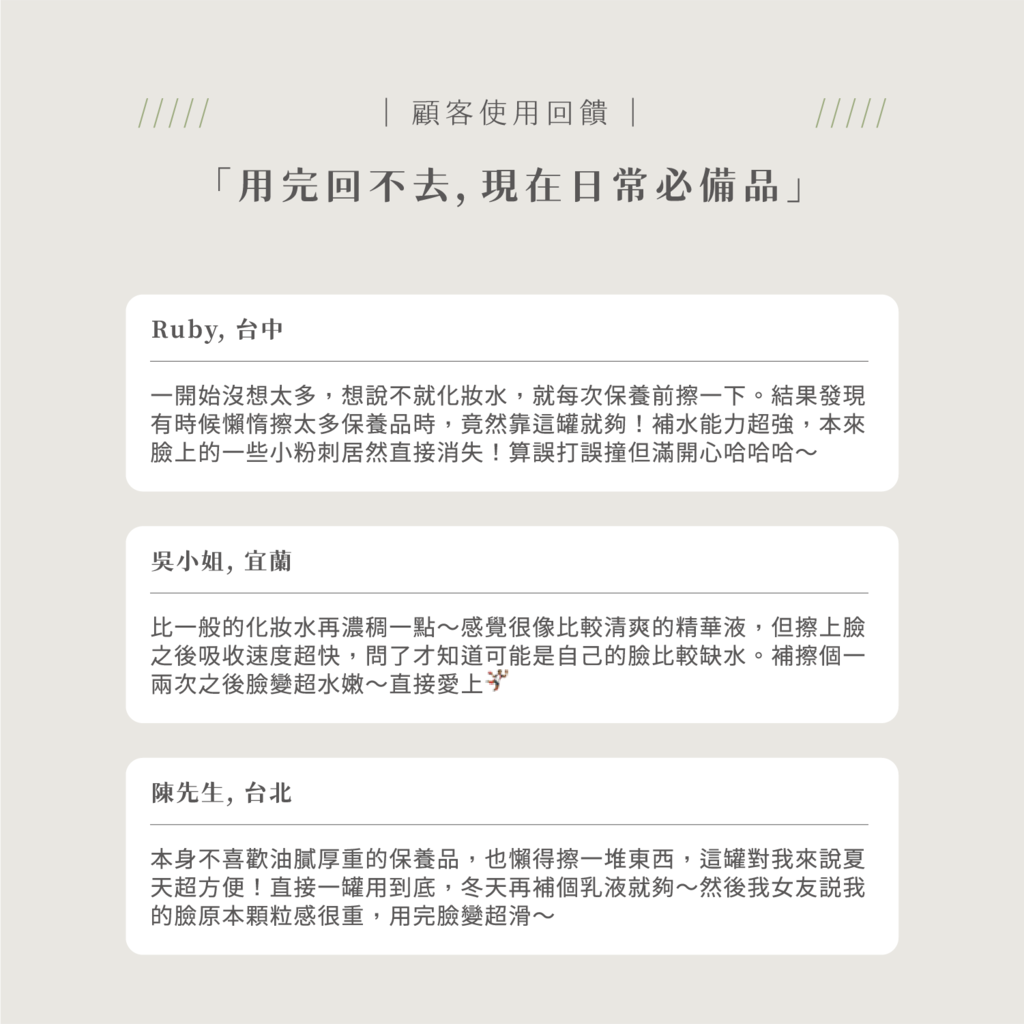 - 高濃度積雪草萃取 - 取代純水,深層修護、舒緩敏感。