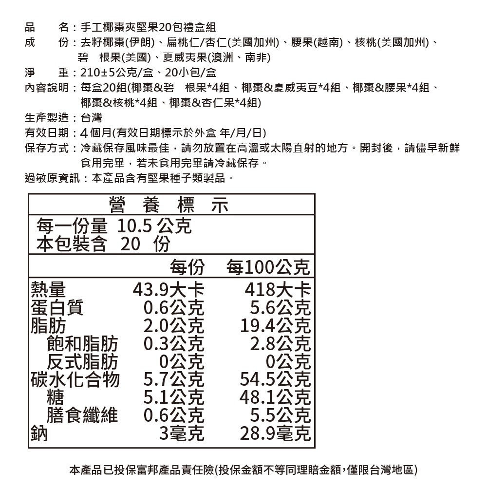 - 過敏原資訊:本產品含有堅果種子類製品。