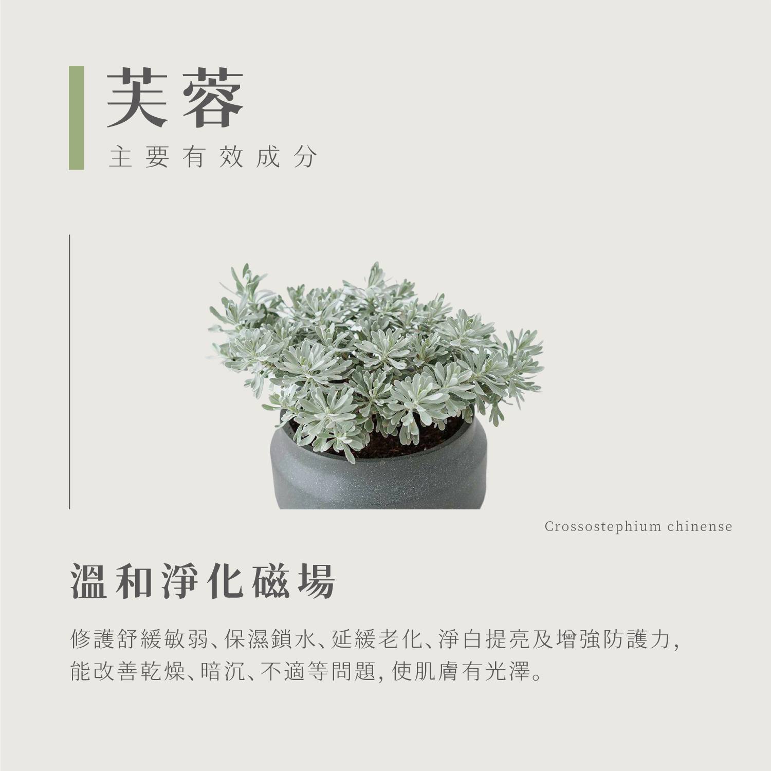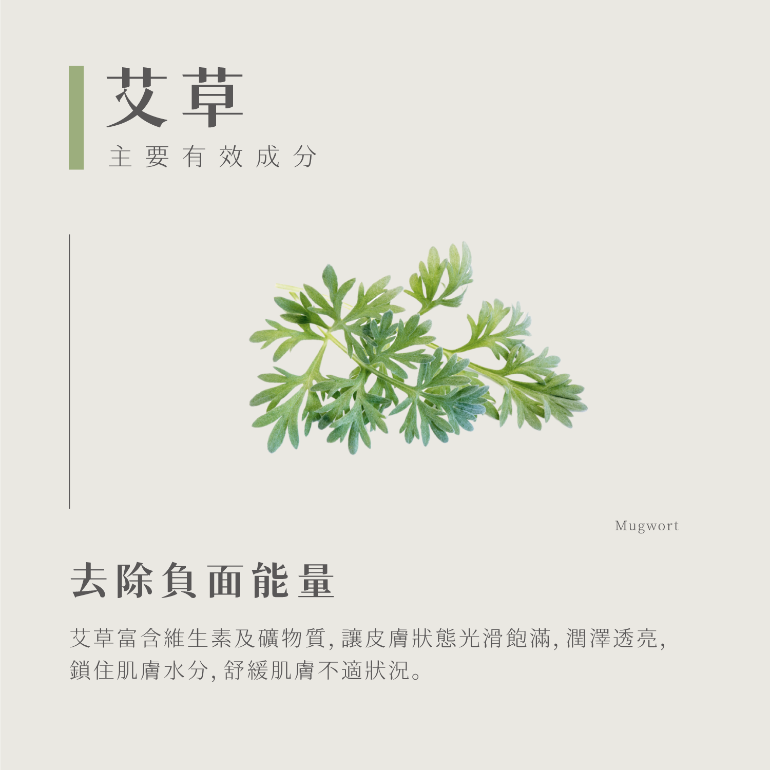 - 嚴選芙蓉、艾草、抹草三種草本植物蒸餾而成。