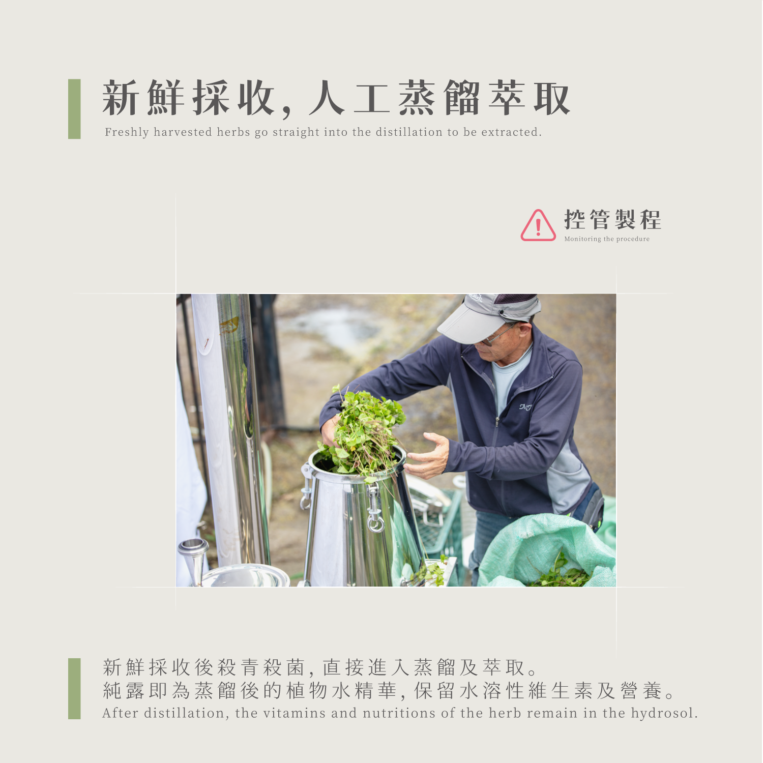- 以水蒸餾一次萃取,保留植物最單純的水相精華。