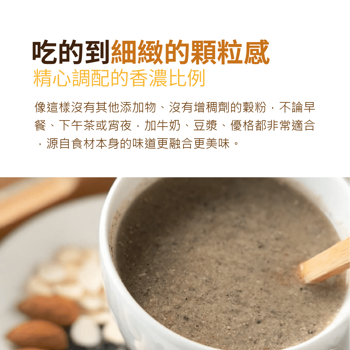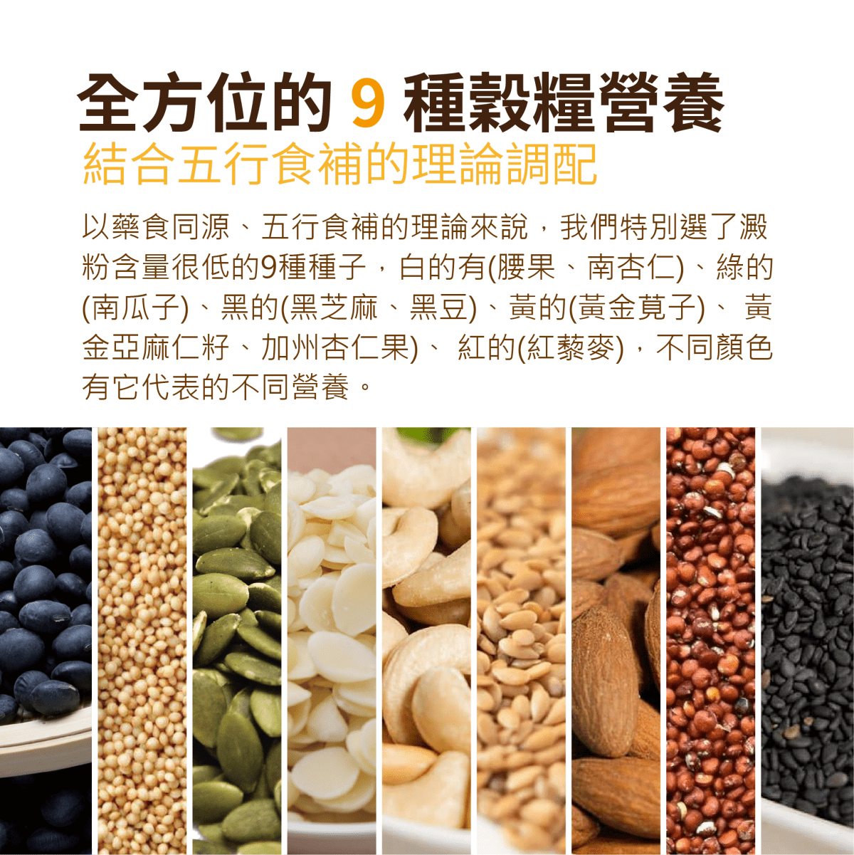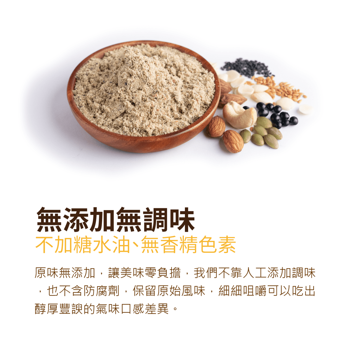 - 成份:杏仁果(美國)、黃金亞麻仁籽(美國/加拿大)、腰果(越南)、南瓜子、南杏仁(中國)、青仁黑豆、黑芝麻(台灣)、黃金莧籽(秘魯)、紅藜麥(秘魯)