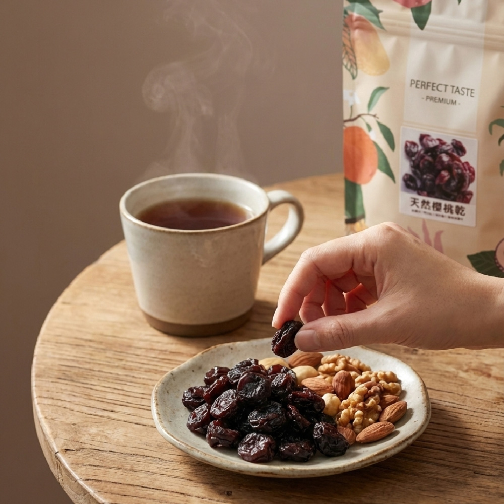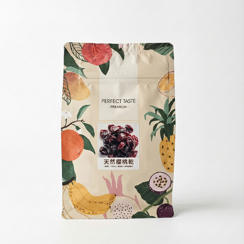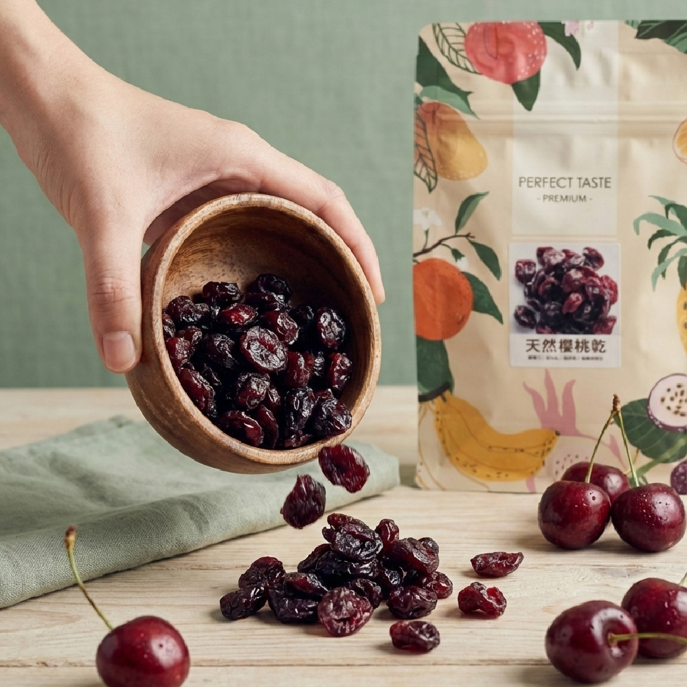 A:我們特別選用美國雷尼爾櫻桃,這種品種本身甜度就很高。吃起來是那種淡淡的、很高級的清甜,尾韻才帶一點點果實自然的微酸,這才是真正櫻桃成熟時的味道,不會像市售加了糖的果乾那樣死甜膩口。