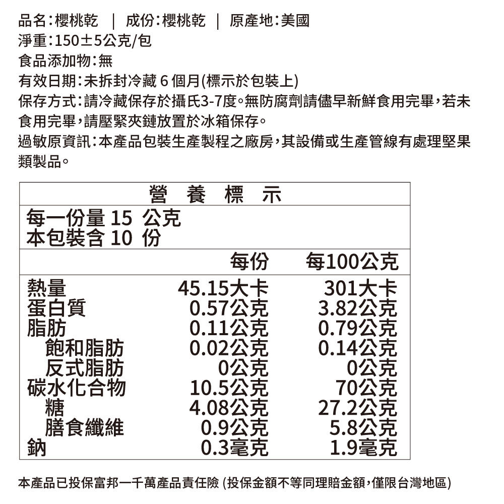 A:這款是非常好的選擇!成分表打開看就只有「櫻桃」兩個字,沒有看不懂的化學名詞。因為沒有額外加糖和油,熱量比一般果乾低很多。想吃甜點時改吃這個,既能滿足口腹之慾,又不用擔心吃進多餘的負擔。