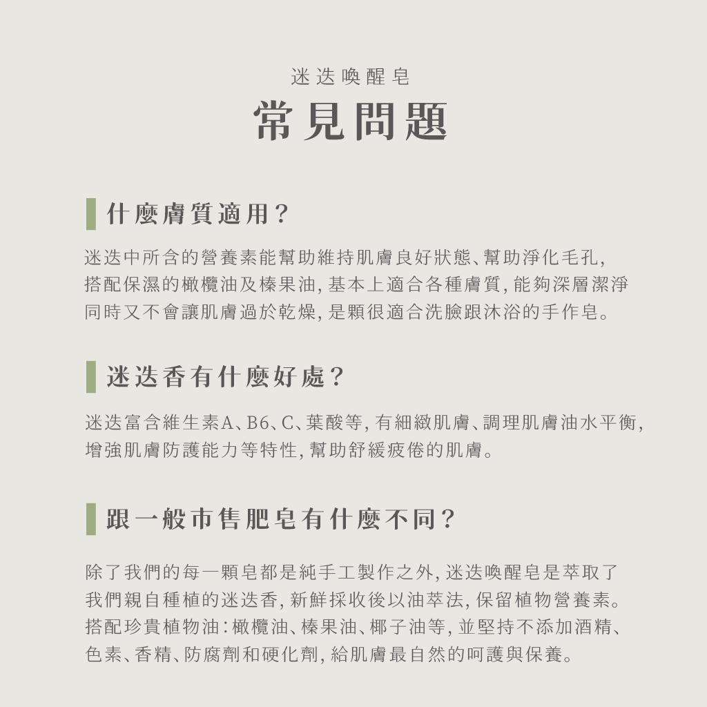 - 注意事項:※不含硬化劑的手工皂,較容易溶於水,平常未使用時請保持皂體乾燥或讓皂立起來晾乾。※自然植物油製成,存放時請避免陽光直射。